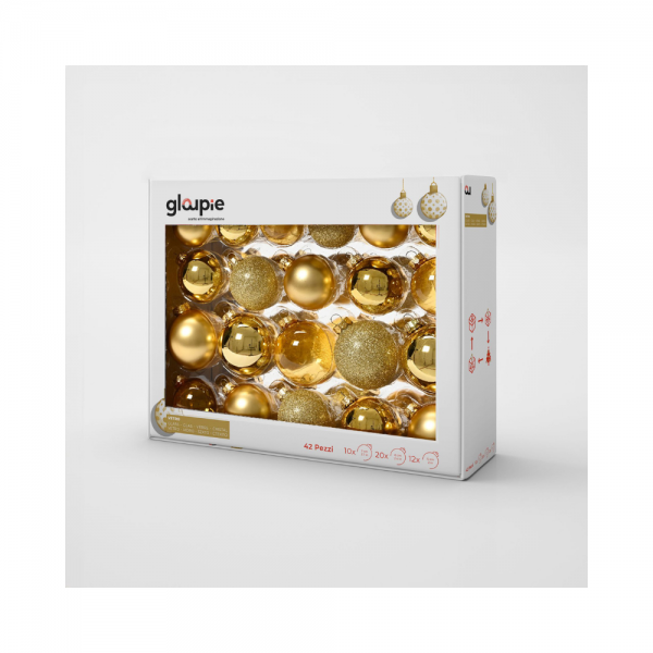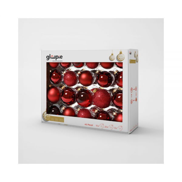 GLOUPIE Box 42 Palline Per Albero Di Natale In Vetro Resistente Oro, 3 Misure Ø 7, 6, 5 cm, In Diverse Finiture Color Rosso