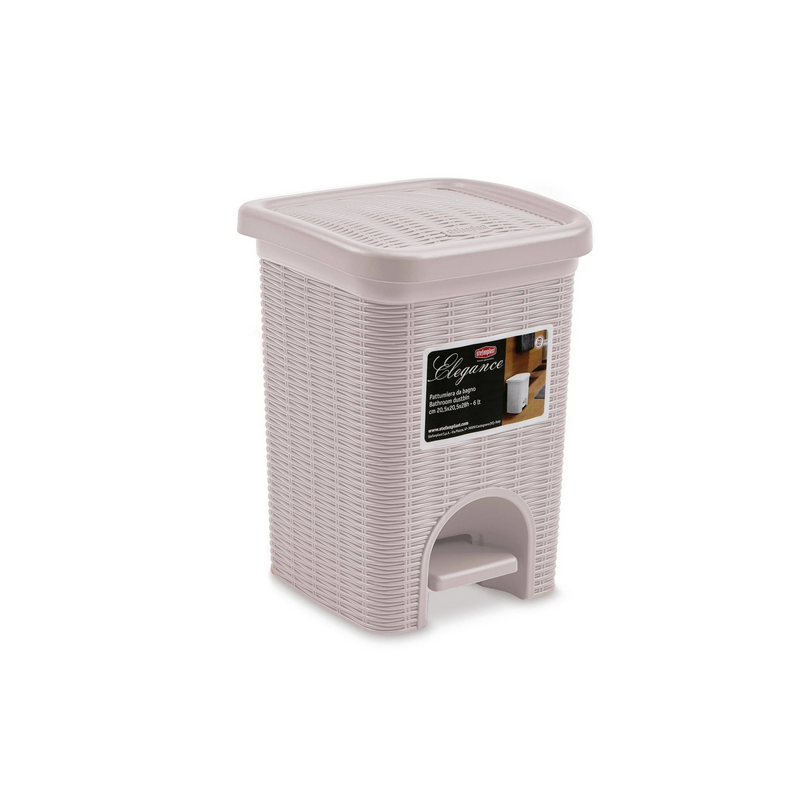 Pattumiera da bagno dal design moderno e raffinato in finitura midollino, pratica e funzionale grazie alla comoda apertura a pedale antiscivolo e facile da pulire perché completamente in plastica, con cestello estraibile.