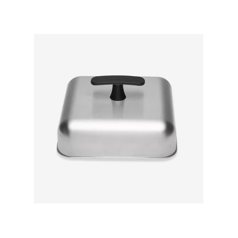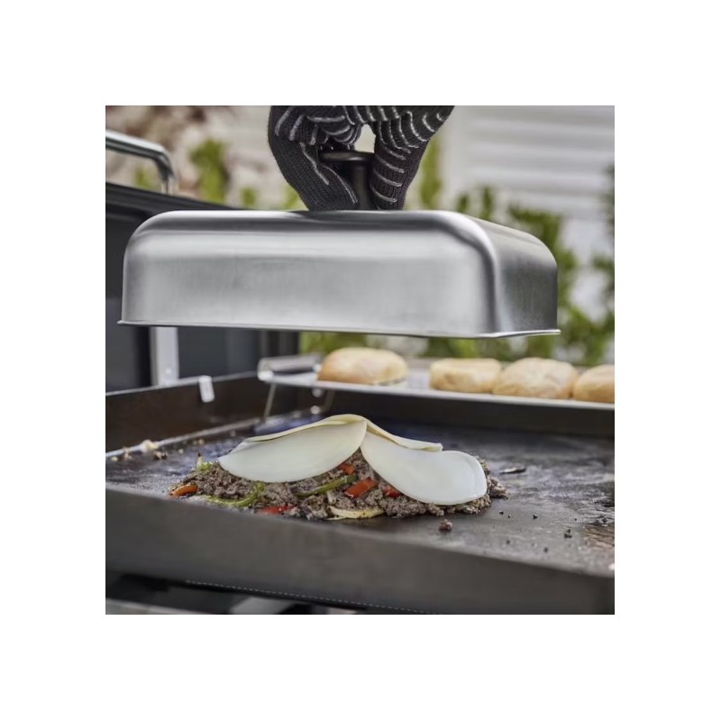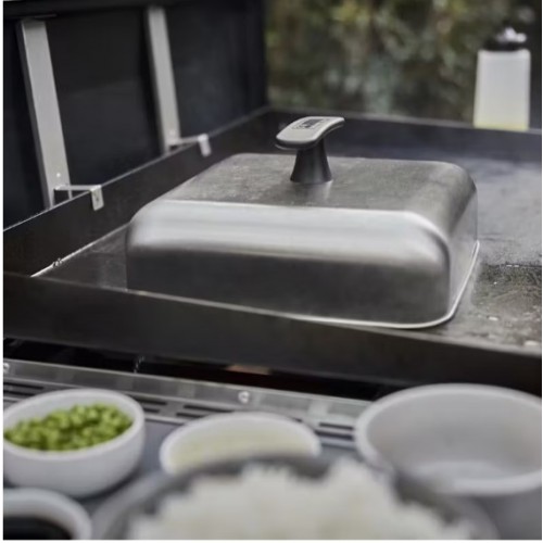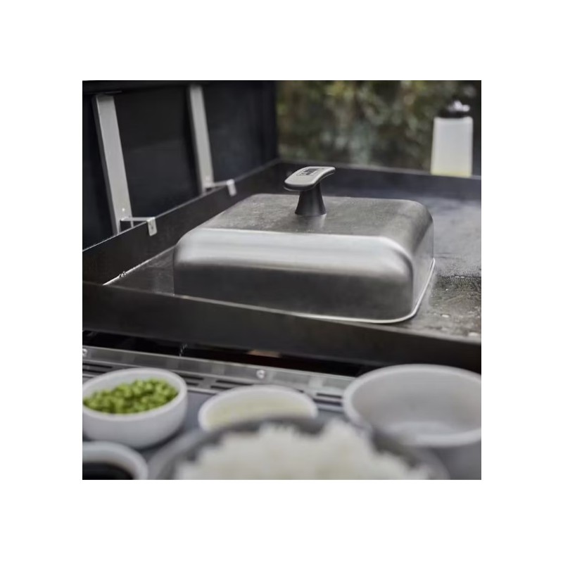 Il manico a T consente di spostarla facilmente durante la cottura sul barbecue, mentre il bordo rinforzato crea una tenuta ermetica che impedisce la fuoriuscita di calore, facendo cuocere rapidamente il cibo.