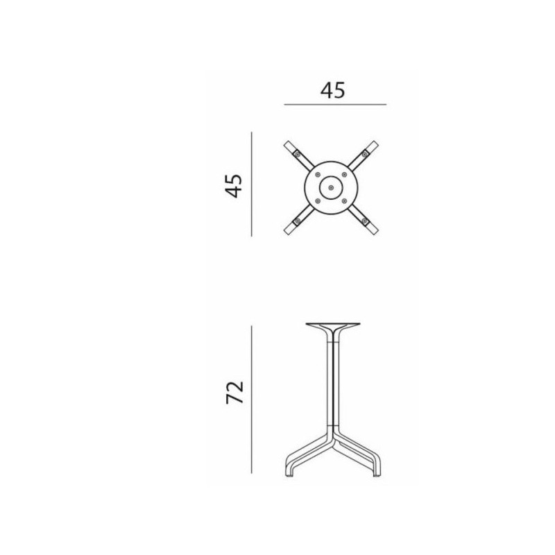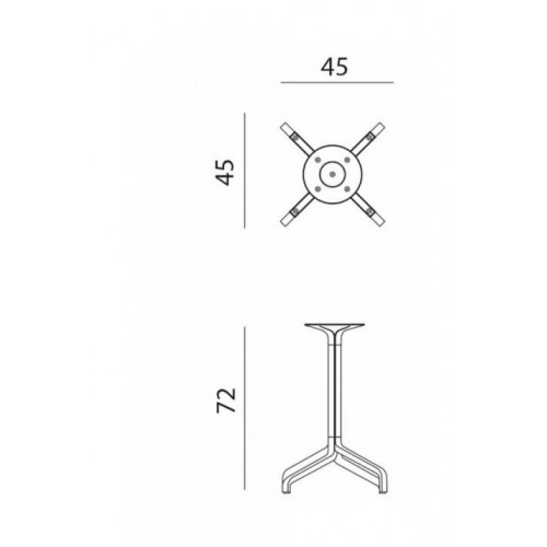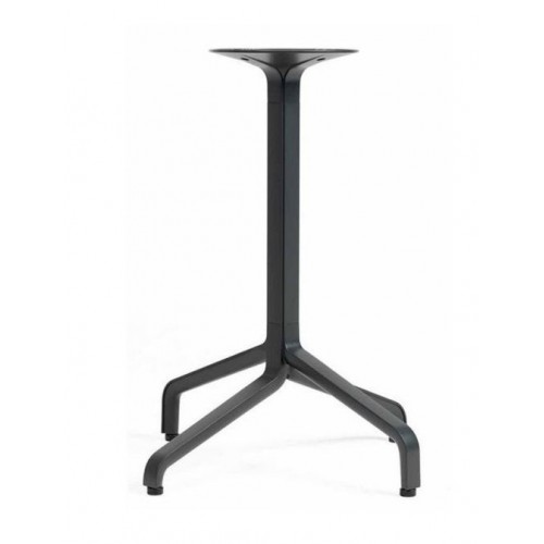 Base per tavolo pieghevole realizzata in alluminio verniciato disponibile in 4 varianti di colore. Impilabile orizzontalmente e dotata di piedini regolabili. La base si compone di una gamba centrale a 4 piedi con una forma che ricorda quella di un albero rovesciato. Adatta per un uso professionale con piani di misure 60 x 60 , 70 x 70 , Ø 60 , Ø70.