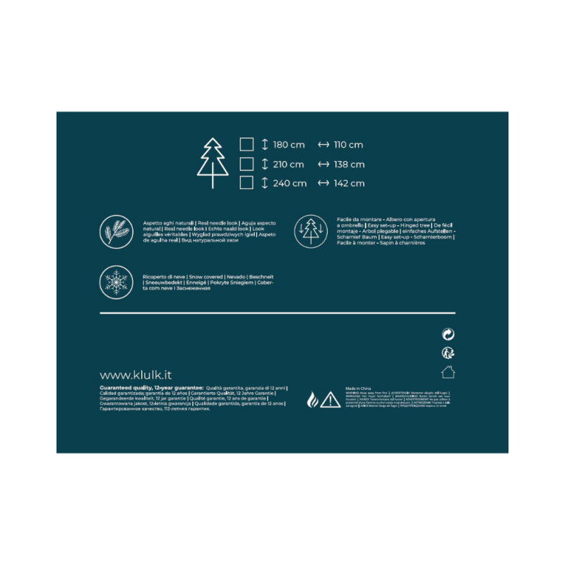 - KLULK Albero Di Natale Ortisei Innevato Con Pigne 210 cm, Diametro 138 Cm, Apertura Ad Ombrello, Ignifugo, Garanzia 12 Anni