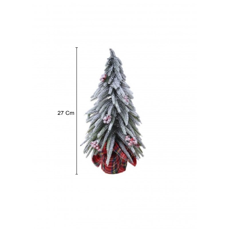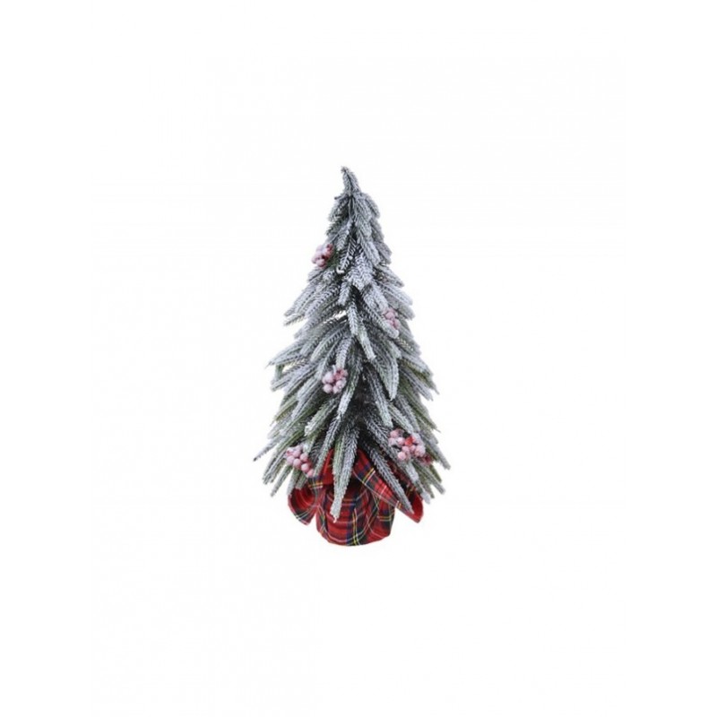 Albero di Natale verde ed innevato con bacche rosse e vaso rivestito con stoffa stile scozzese.