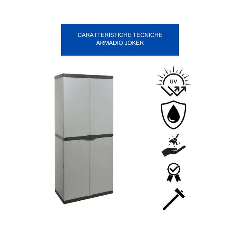 Prodotto Made In Italy Realizzato Con Materiali Di Qualità, L'Armadio Joker Garantisce Una Resistenza Eccezionale Agli Urti, Ai Graffi E Alle Intemperie. La Base, La Copertura Superiore, Le Maniglie, I Montanti E I Pannelli Posteriori Sono In Resina Di Polipropilene Alveolare, Un Materiale Noto Per La Sua Robustezza E La Sua Capacità Di Sopportare Carichi Pesanti. Gli Altri Pannelli E I Ripiani Sono Invece In Resina Di Pvc, Che Offre Flessibilità E Resistenza All'Umidità