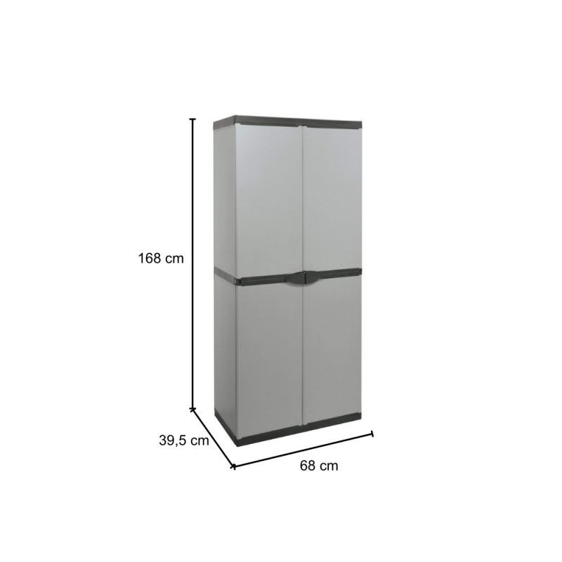 GLOUPIE Armadio Multiuso Da Interno Ed Esterno Alto Con 2 Ante E 4 Ripiani, Linea Joker, Realizzato In Resina PVC E Polipropilene Alveolare Resistente Agli Urti, Ai Graffi E Alle Intemperie In Combo Di Colorazione Grigio E Nero, Lunghezza 68 Cm x Profondità 39,5 Cm x Altezza 168 Cm, In Kit Di Montaggio Facile Da Assemblare, Modular System Per Ancorarlo Semplicemente Agli Altri Prodotti Della Stessa Linea, Completo Di Chiusura Lucchettabile