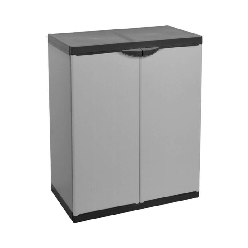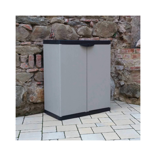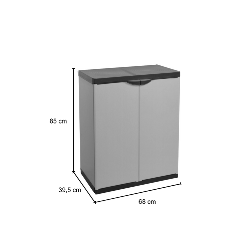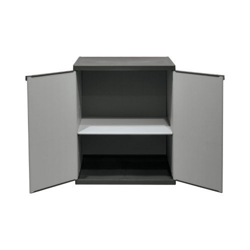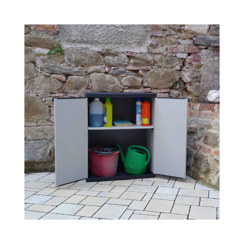 GLOUPIE Armadietto Multiuso Da Interno Ed Esterno Basso Con 2 Ante E 2 Ripiani, Linea Joker, Realizzato In Resina PVC E Polipropilene Alveolare Resistente Agli Urti, Ai Graffi E Alle Intemperie In Combo Di Colorazione Grigio E Nero, Lunghezza 68 Cm x Profondità 39,5 Cm x Altezza 85 Cm, In Kit Di Montaggio Facile Da Assemblare, Modular System Per Ancorarlo Semplicemente Agli Altri Prodotti Della Stessa Linea, Completo Di Chiusura Lucchettabile