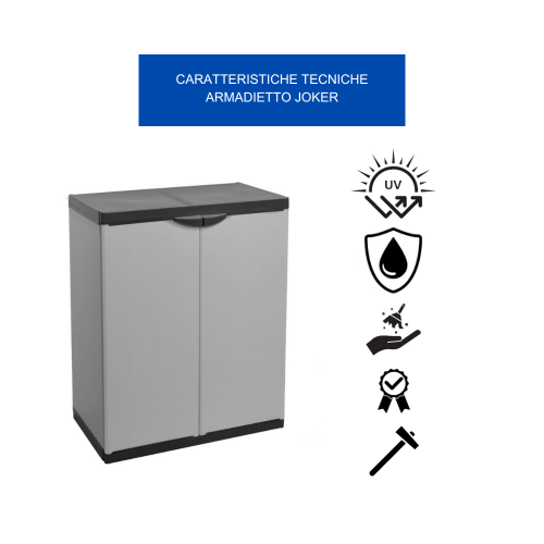 Prodotto Made In Italy Realizzato Con Materiali Di Qualità, L'Armadio Joker Garantisce Una Resistenza Eccezionale Agli Urti, Ai Graffi E Alle Intemperie. La Base, La Copertura Superiore, Le Maniglie, I Montanti E I Pannelli Posteriori Sono In Resina Di Polipropilene Alveolare, Un Materiale Noto Per La Sua Robustezza E La Sua Capacità Di Sopportare Carichi Pesanti. Gli Altri Pannelli E I Ripiani Sono Invece In Resina Di Pvc, Che Offre Flessibilità E Resistenza All'Umidità