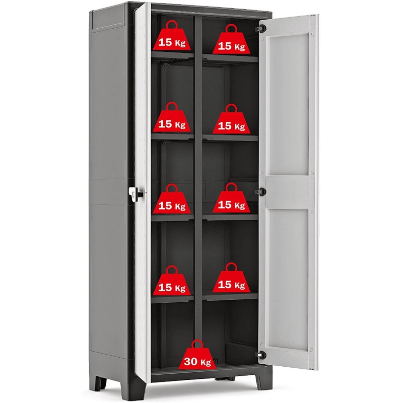 design made in italy, massima sicurezza e stabilità per questo l’armadio portascope titan multispace diventa un vero e proprio sistema di organizzazione dello spazio, solido e sicuro, anche grazie ai piedini frontali regolabili in altezza. ottimo come armadio da balcone per arredo esterni, grazie alla sua resistenza all’acqua e dalle robuste cerniere in metallo che evitano l’involontaria apertura delle ante dovuta da forte vento. grazie al design made in italy elegante e moderno, gli armadi portascope titan multispace sono ottimi complementi d’arredo per gli ambienti interni della casa come lavanderia, ripostiglio o garage. armadio portascope 2 ante, 4 ripiani regolabili cm l80 x p44 x h182