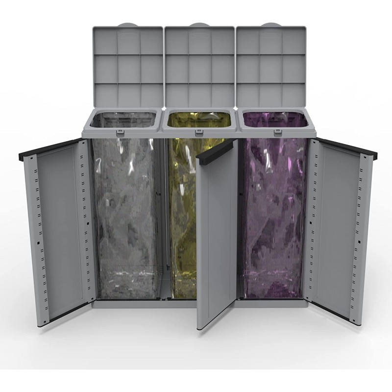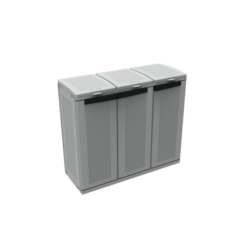Armadietto a tre ante ideato per la raccolta differenziata dei rifiuti. Dotato di due porta-sacco da 110 lt ciascuno chiudibili con coperchio. L\'apertura delle ante permette una facile estrazione frontale dei sacchi pieni. Adatto per utilizzo in ambiente esterno . Dimensioni: 102x39x88,7cm - 110+110+110lt.\nProdotto eco-friendly realizzato al 100% con plastica riciclata e riciclabile al 100%.