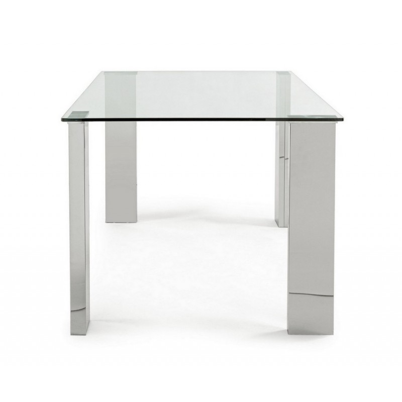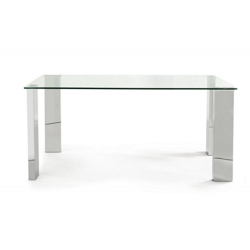 Dotato di gambe in MDF rivestite con lamina in acciaio lucido spessore 0.3 mm, piano in vetro temperato spessore 12 mm.