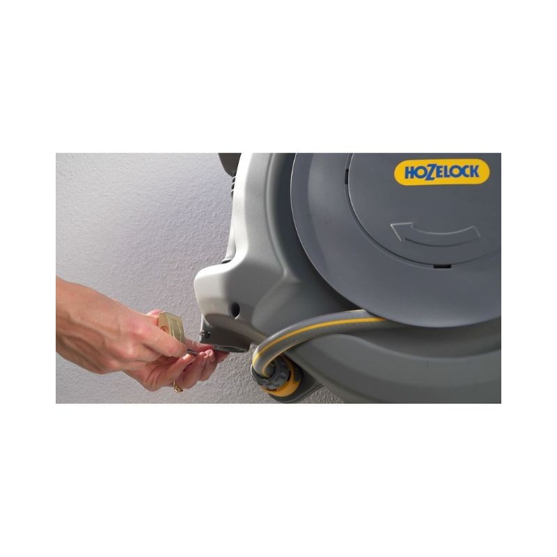 Pulito, ordinato e protetto – L’Auto Reel conserva il tubo in modo ordinato e lo protegge in un robusto alloggiamento in polipropilene stabilizzato ai raggi UV, assicurando uno stivaggio sicuro