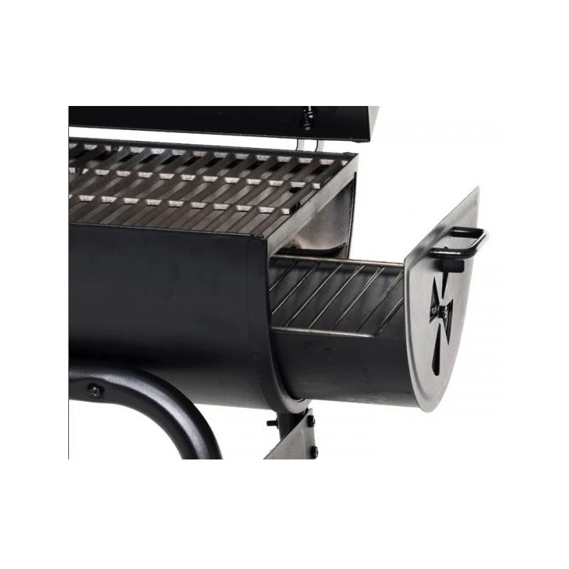 area di cottura 45x38cm con griglia in ghisa, cesto carbone estraibile con sistema rabbocco facile, mensola laterale, ganci per utensili e base inferiore con ripiano portaoggetti.