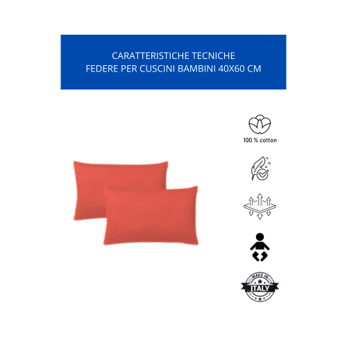 - KLULK Set 2 Federe Per Cuscini Per Bambini 40x60 Cm,In Puro Cotone 100% Fibra Naturale In Tinta Unita Pomodoro Made In Italy