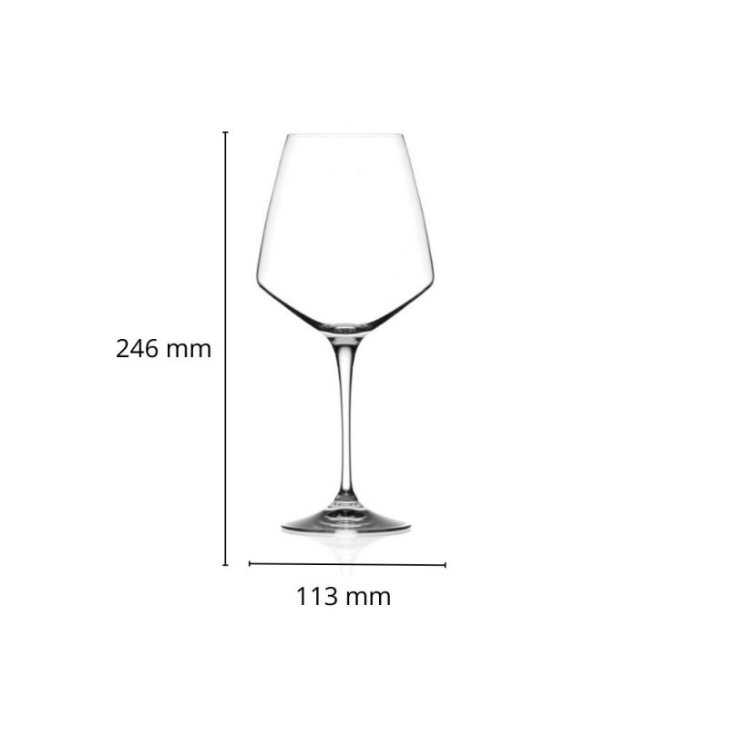 [Descrizione del Calice]: Il disegno della coppa nell’angolo di massima curvatura indica il giusto livello del vino da versare, mentre la parte bassa conica del calice permette di apprezzarne le gradazioni di colore nel suo massimo splendore.