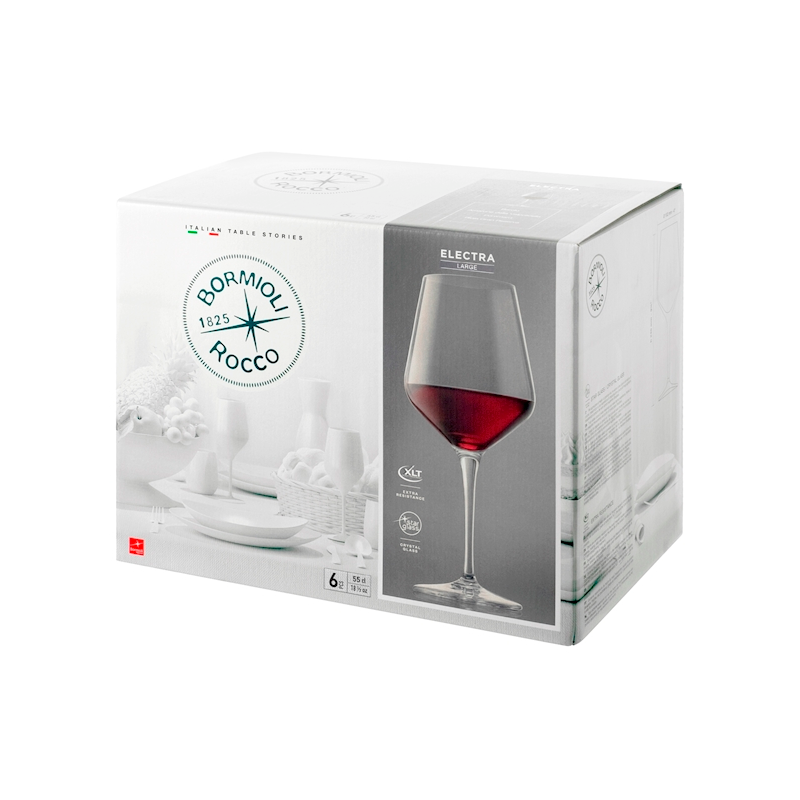 Set Calici Electra Large: la scelta ideale per i professionisti del settore contract. La collezione Electra è un'offerta completa di calici per vino, nata per soddisfare le richieste più esigenti. Il calice Electra da 54,5 cl è ideale per il servizio di vini strutturati, in particolare di quelli rossi. La sua forma, con una coppa ampia e un gambo lungo, permette di esaltare gli aromi e le caratteristiche organolettiche del vino. Lo stile pulito e moderno del calice Electra si adatta a ogni tipo di situazione, dalla tavola informale a quella più formale. La lavorazione del calice Electra è realizzata con un'attenzione particolare alla qualità. Lo stelo, prodotto in un unico pezzo con la coppa, viene sottoposto a una particolare trazione e lavorazione a caldo. Il taglio del bordo del calice viene effettuato con un fascio laser, che permette di ottenere un bordo bevente, lineare e omogeneo. Questa tecnologia di lavorazione accresce la qualità del prodotto e lo rende ideale per la degustazione professionale