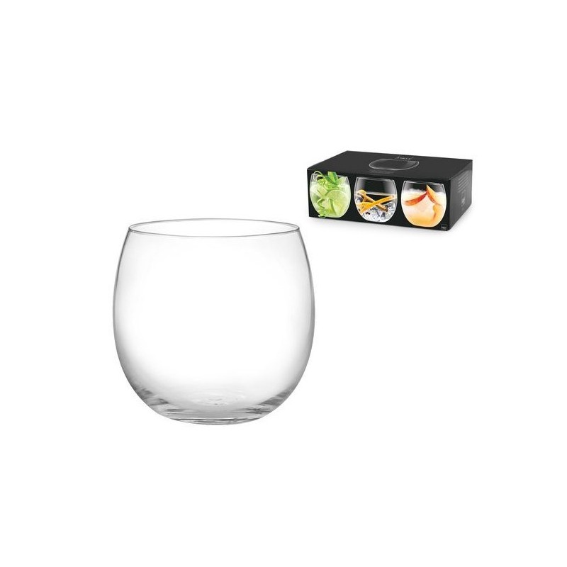 Bicchiere in vetro trasparente dalla forma bombata e un'ottima base stabile. Risponde alle esigenze di praticità ed estetica.