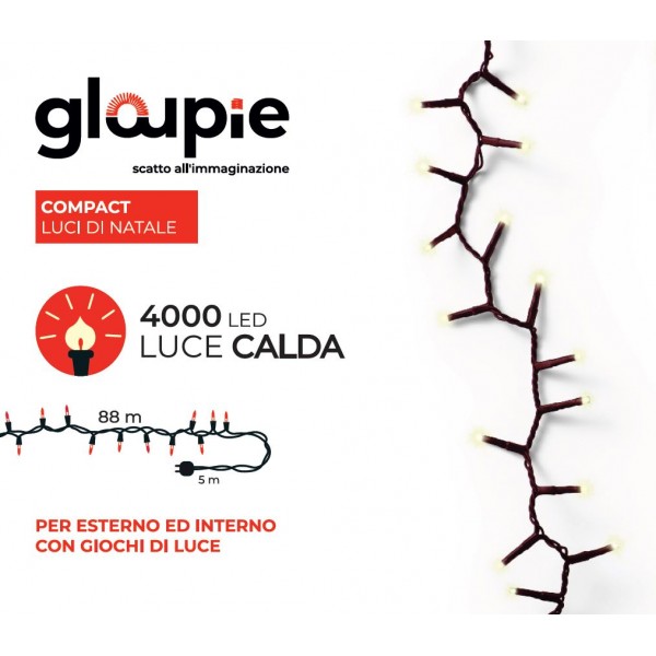GLOUPIE Luci Di Natale Compact da 93 MT Con 4000 led Bianco Caldo, Cavo Verde, Distanza Luci 2.2 Cm, Funzione Memoria e Timer