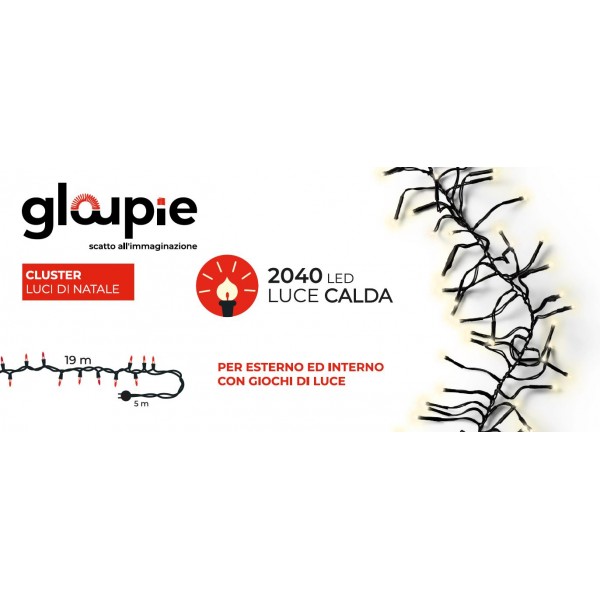 GLOUPIE Luci Di Natale Cluster da 24 Mt Con 2040 Led Bianco Caldo, Cavo Verde, Funzione Memoria e Timer