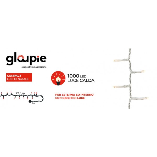 GLOUPIE Luci DI Natale Compact da 27.5 MT Con 1000 led Bianco Caldo,Trasparente , Distanza Luci 2.2 Cm, Memoria e Timer
