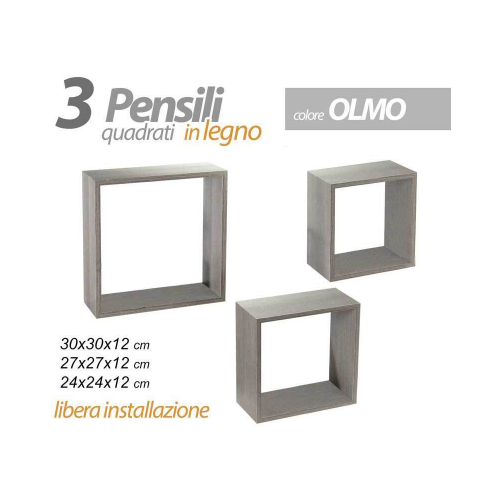- Set 3 Pensili Sospesi A Forma Quadrata Da Parete in Legno Olmo A Libera Installazione