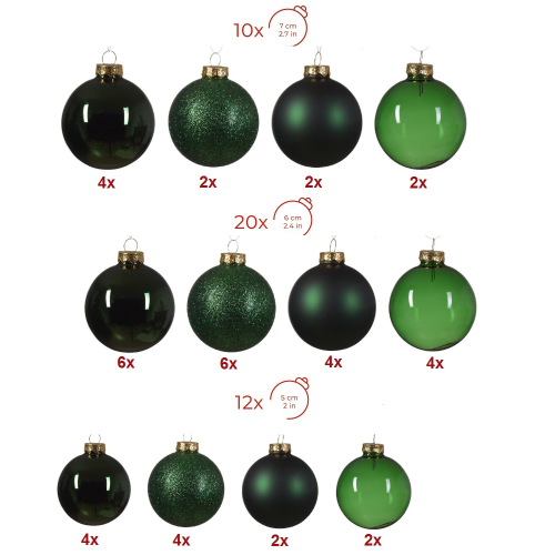 - GLOUPIE Box 42 Palline Per Albero Di Natale In Vetro Resistente Verde, 3 Misure Ø 7, 6, 5 cm, In Diverse Finiture Color Rosso