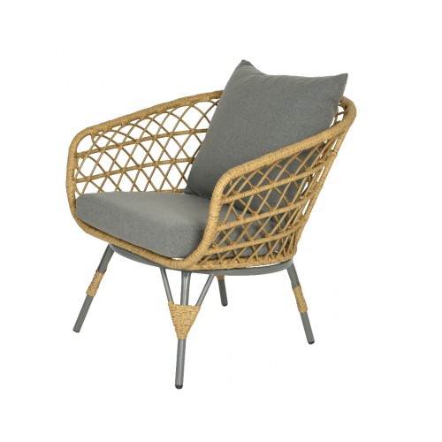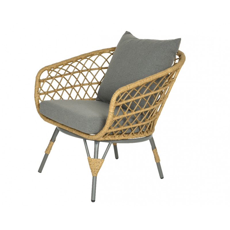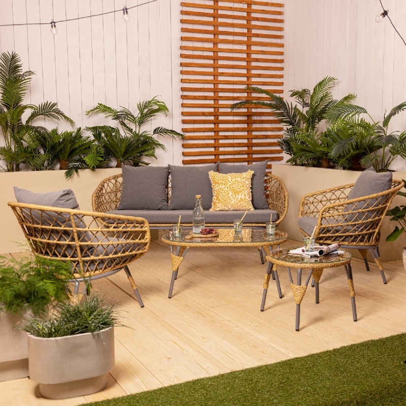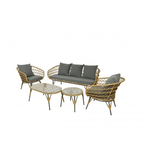 [Design elegante e moderno]: Il salotto da esterno mykonos e' un complemento d'arredo elegante e moderno che si adatta al meglio al tuo giardino, terrazzo, patio o balconata. Il design raffinato è caratterizzato dal mix di colore naturale del poli-vimini e il grigio dei cuscini. Completo di un divanetto, due poltrone e due tavolini offre spazio a sufficienza per 5 persone, relegandogli un'esperienza senza pari e una seduta confortevole con tanto di appoggio per riporre la propria oggettistica