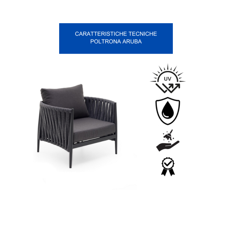 [ROBUSTEZZA FENOMENALE PER UN RELAX DURATURO]: La Poltrona Aruba è Realizzata Con Una Struttura In Alluminio Verniciato A Polvere Di Poliestere Antracite, Resistente A Pioggia, Sole, Graffi E Urti. L'Intreccio In Corde Di Tetoron 100% Poliestere Resistente Alle Intemperie, Si Rivela Morbido E Avvolgente Al Tatto, Garantendo Un Comfort Senza Pari. Completa L'Opera L'Imbottitura In Gomma Polietilene, Che Accarezza Il Corpo E Dona Un'Ulteriore Sensazione Di Morbidezza Per Un Relax Assoluto