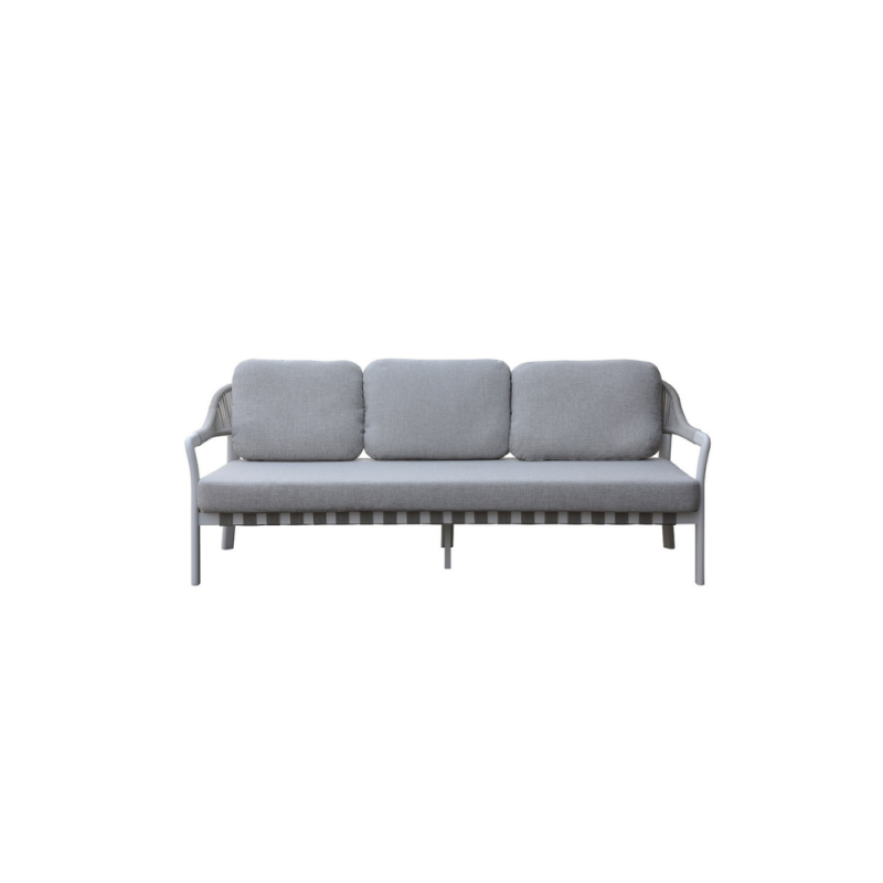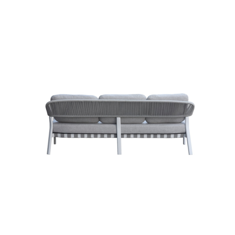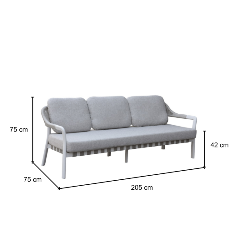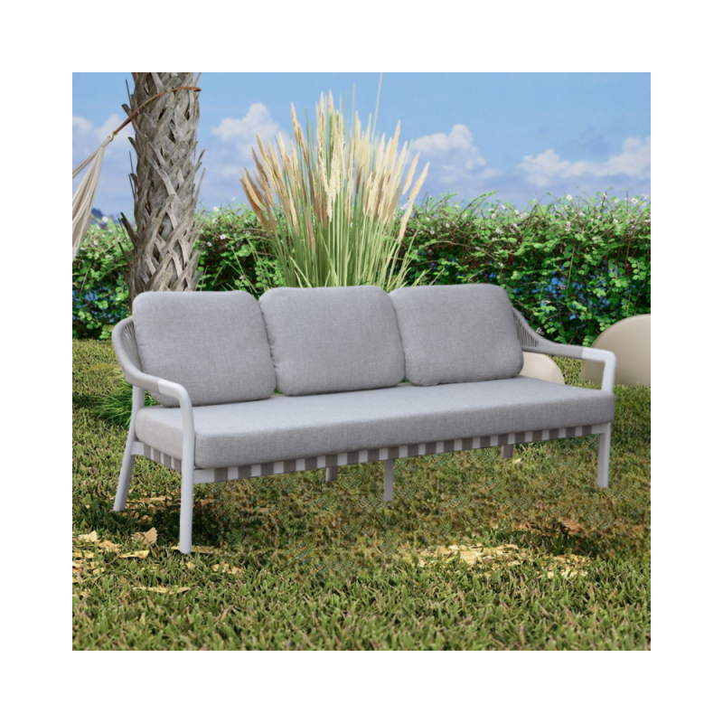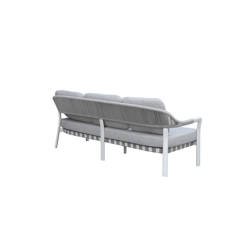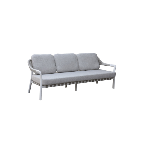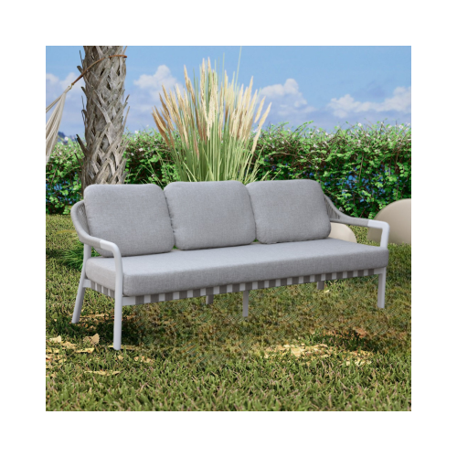 [QUALITA' CERTIFICATA]: KLULK Divano Da Esterno 3 Posti Martinica Con Struttura In Alluminio Verniciato A Polvere Di Poliestere Bianca Resistente Alle Intemperie, Ai Raggi UV, Ai Graffi Ed Agli Urti, Con Intreccio In Corde Di Tetoron 100% Poliestere, Completo Di Cuscino Seduta E Schienale Sfoderabile E Lavabile In Tessuto Olefin 100% Polipropilene Anti Ingiallimento E Usura Grigio Chiaro, Lunghezza 205 Cm X Profondità 75 Cm X Altezza 75 Cm