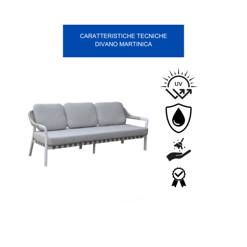 [ROBUSTEZZA FENOMENALE PER UN RELAX DURATURO]: Il Divano Martinica è Realizzato Con Una Struttura In Alluminio Verniciato A Polvere Di Poliestere Bianca, Resistente A Pioggia, Sole, Graffi E Urti. L'Intreccio In Corde Di Tetoron 100% Poliestere Resistente Alle Intemperie, Si Rivela Morbido E Avvolgente Al Tatto, Garantendo Un Comfort Senza Pari, Che Accarezza Il Corpo E Dona Un'Ulteriore Sensazione Di Morbidezza Per Un Relax Assoluto
