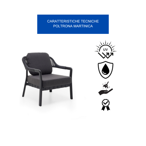 [ROBUSTEZZA FENOMENALE PER UN RELAX DURATURO]: La Poltrona Martinica è Realizzata Con Una Struttura In Alluminio Verniciato A Polvere Di Poliestere Antracite, Resistente A Pioggia, Sole, Graffi E Urti. L'Intreccio In Corde Di Tetoron 100% Poliestere Resistente Alle Intemperie, Si Rivela Morbido E Avvolgente Al Tatto, Garantendo Un Comfort Senza Pari, Che Accarezza Il Corpo E Dona Un'Ulteriore Sensazione Di Morbidezza Per Un Relax Assoluto
