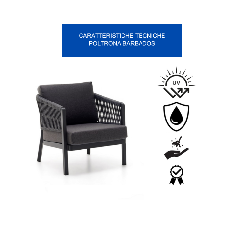 [ROBUSTEZZA FENOMENALE PER UN RELAX DURATURO]: La Poltrona Barbados è Realizzata Con Una Struttura In Alluminio Verniciato A Polvere Di Poliestere Antracite, Resistente A Pioggia, Sole, Graffi E Urti. L'Intreccio In Corde Di Tetoron 100% Poliestere Resistente Alle Intemperie, Si Rivela Morbido E Avvolgente Al Tatto, Garantendo Un Comfort Senza Pari. Completa L'Opera L'Imbottitura In Gomma Polietilene, Che Accarezza Il Corpo E Dona Un'Ulteriore Sensazione Di Morbidezza Per Un Relax Assoluto