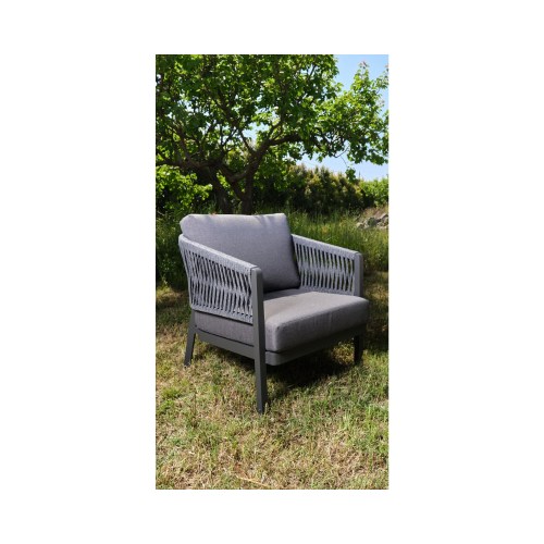 [QUALITA' CERTIFICATA]: KLULK Poltrona Da Esterno Barbados Con Struttura In Alluminio Verniciato A Polvere Di Poliestere Antracite Resistente Alle Intemperie, Ai Raggi UV, Ai Graffi Ed Agli Urti, Con Intreccio In Corde Di Tetoron 100% Poliestere Dall'Imbottitura In Gomma Polietilene, Completa Di Cuscino Seduta E Schienale Sfoderabile E Lavabile In Tessuto Olefin 100% Polipropilene Anti Ingiallimento E Usura Grigio Chiaro, Lunghezza 80 Cm X Profondità 85 Cm X Altezza 72 Cm