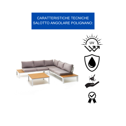 - KLULK Salotto Angolare 5 Posti Polignano Completo Di Divanetti, Tavolino E Cuscini In Acciaio Bianco Con Inserti In Polywood