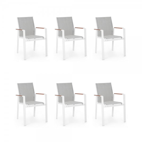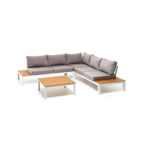 KLULK Salotto Angolare 5 Posti Polignano Completo Di Divanetti, Tavolino E Cuscini In Acciaio Bianco Con Inserti In Polywood