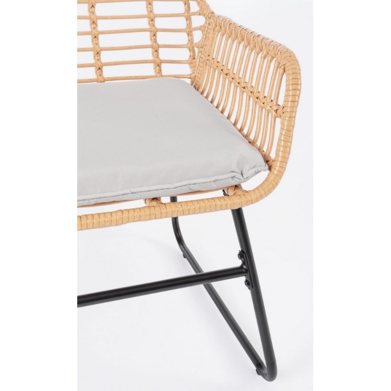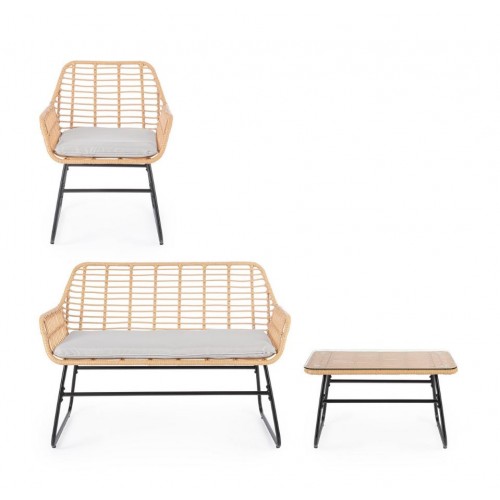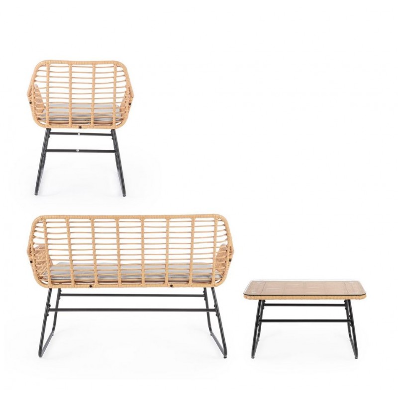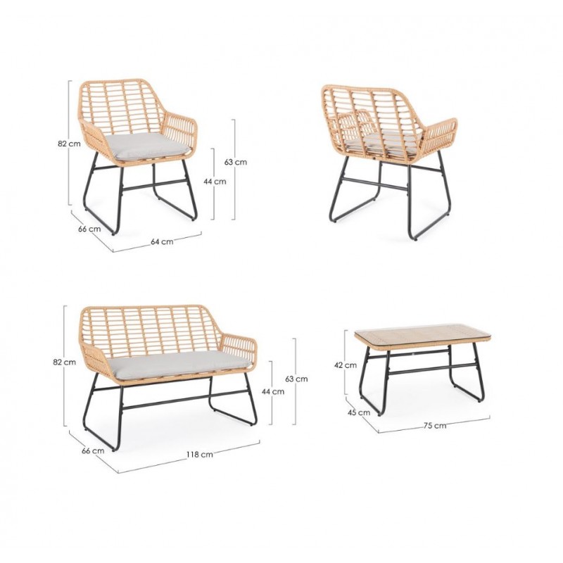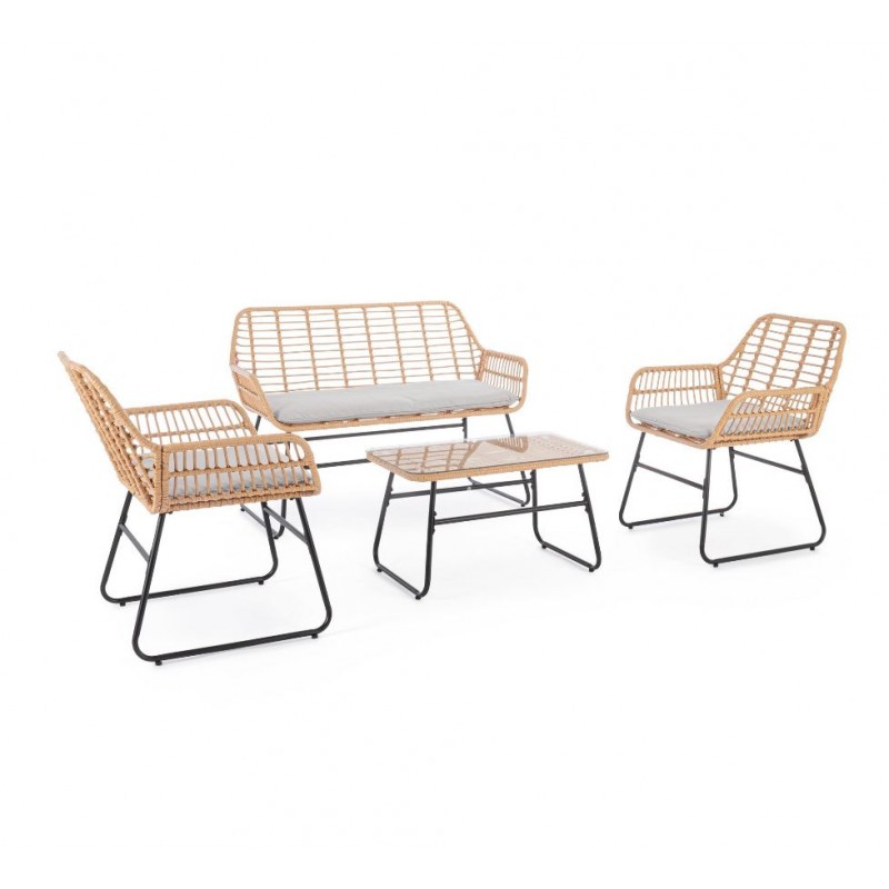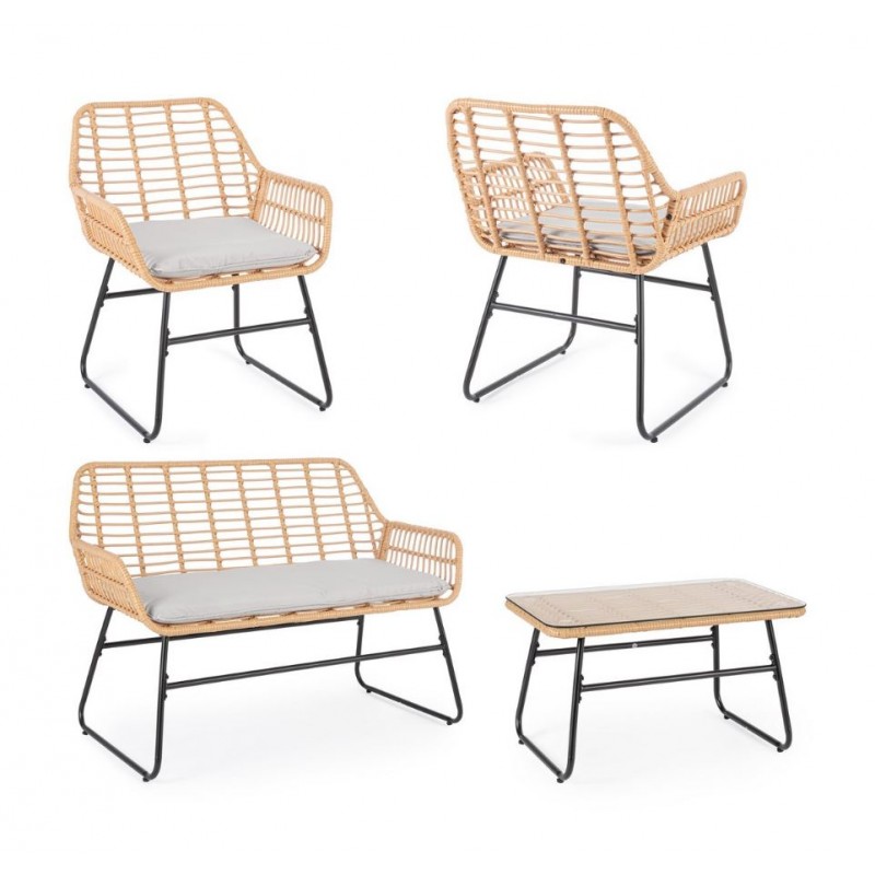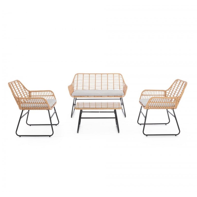 Set 4 Pezzi Salotto Burrel Con Divano, Poltrone E Tavolino Con Struttura In Acciaio E Intreccio In Fibra Sintetica Naturale