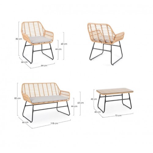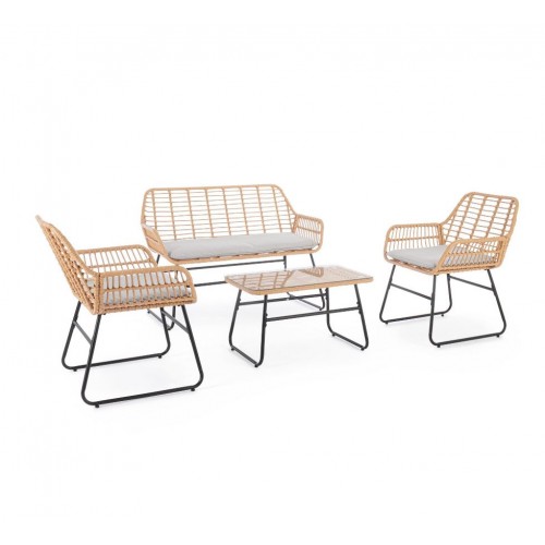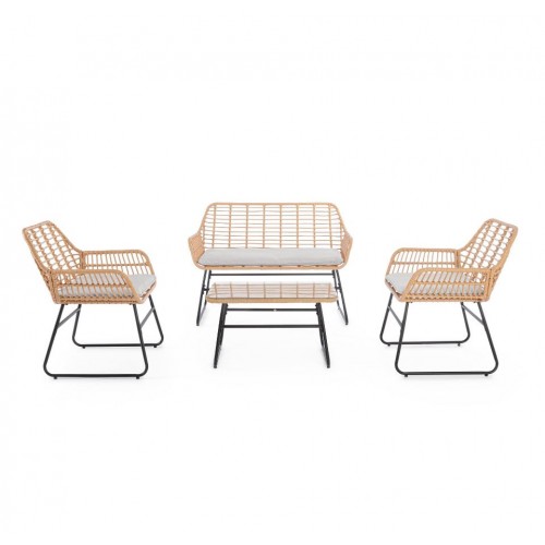- Set 4 Pezzi Salotto Burrel Con Divano, Poltrone E Tavolino Con Struttura In Acciaio E Intreccio In Fibra Sintetica Naturale