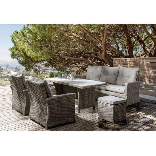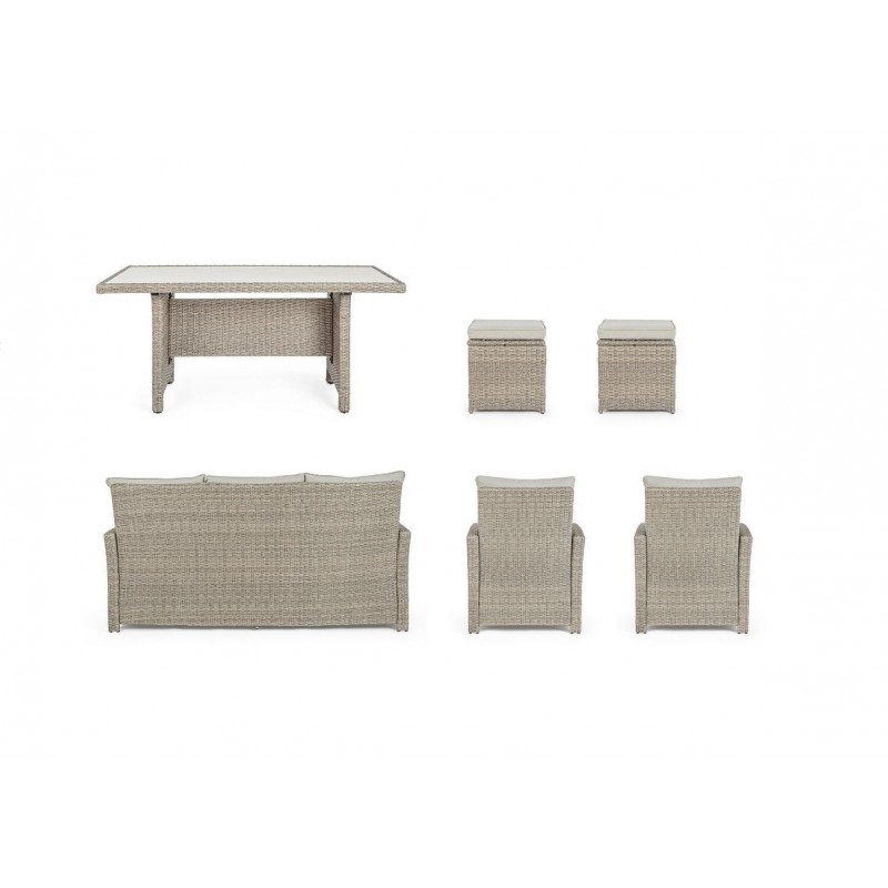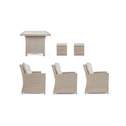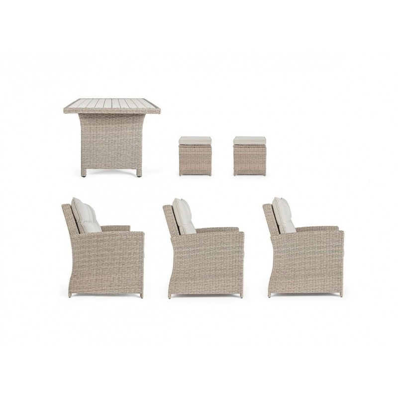 Il tavolo con piano in alluminio e piedini regolabili offre una superficie stabile e versatile, perfetta per pranzi, cene o semplicemente per godersi un momento di relax con gli amici. I due pouf inclusi completano l'arredo e offrono posti a sedere aggiuntivi per i tuoi ospiti.