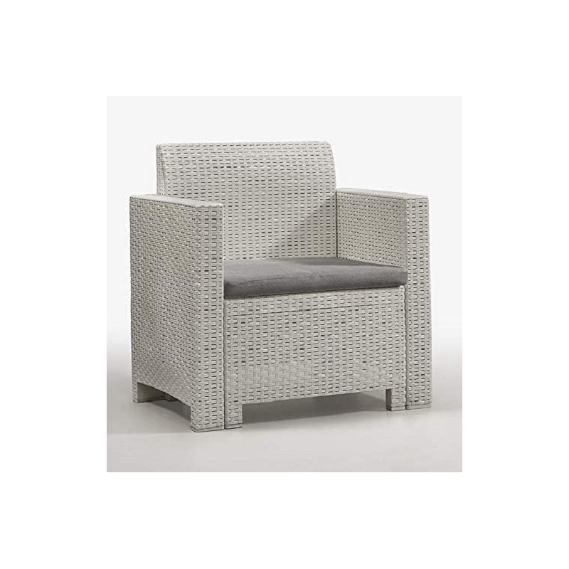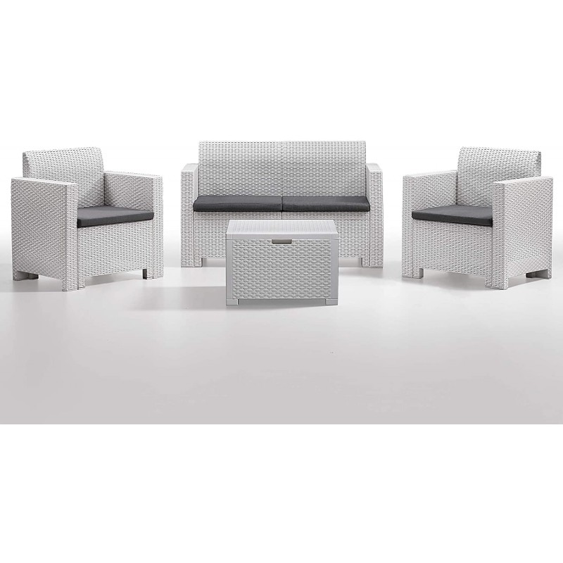 Set di mobili da giardino per 4 persone in design in rattan bianco, divano, 2 poltrone, tavolo contenitore, cuscini inclusi