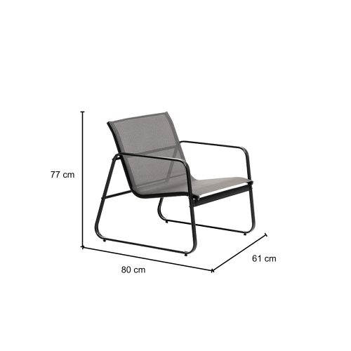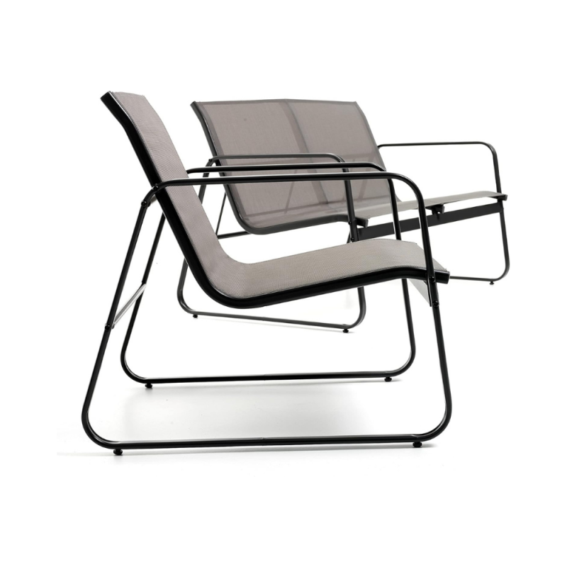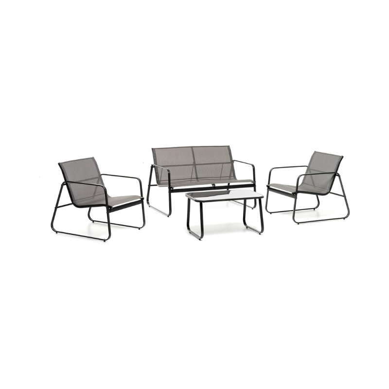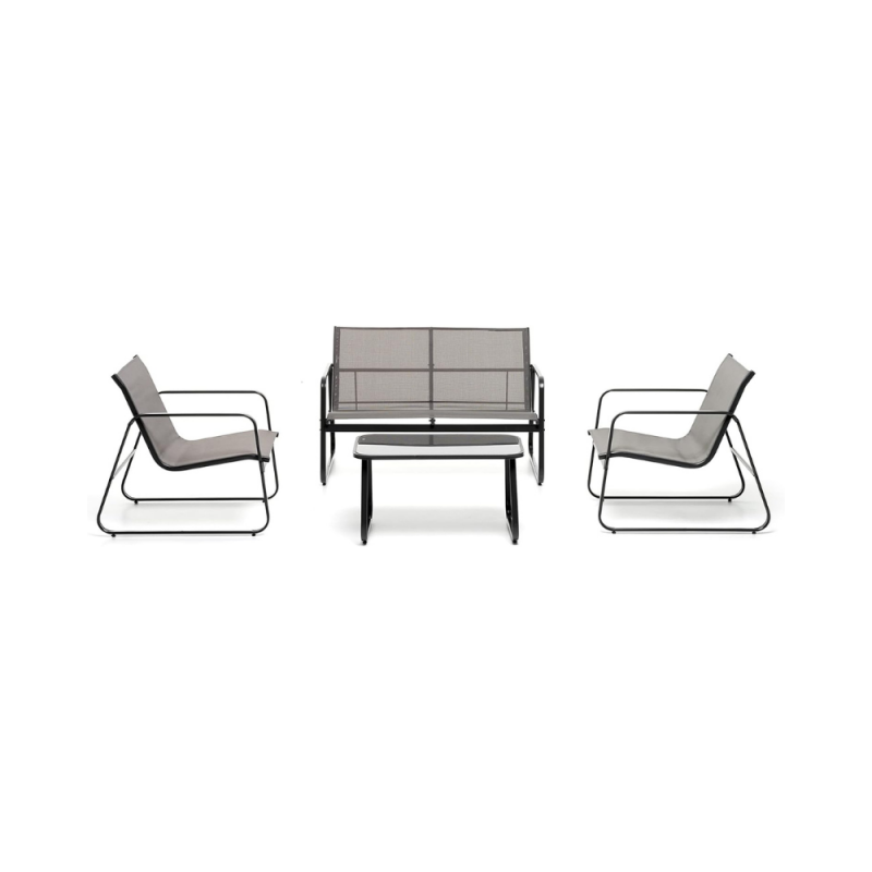 [Qualita' certificata]: Gloupie salotto da esterno per giardini, terrazze, patios, balconate 4 posti linea elon completo di divanetto, poltrone e tavolino con struttura in metallo verniciato a polvere epossidica dalle diverse colorazioni e seduta in textilene resistente alle intemperie e ai raggi uv, piano del tavolino in vetro temperato, facile da assemblare in poco tempo, misure divanetto l 113 x p 80 x h 77 cm; poltrona l 61 x p 80 x h 77 cm; tavolino l 85 x p 50 x h 39 cm
