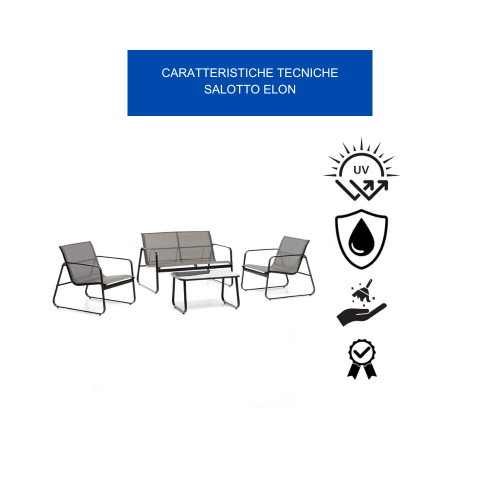 [Robustezza e durata per un investimento sicuro]: Il salottino è realizzato con materiali di alta qualità che garantiscono robustezza e durata nel tempo. La struttura in metallo verniciato a polvere epossidica resiste agli agenti atmosferici e all'usura, mentre il textilene delle sedute mantiene intatte le sue caratteristiche di comfort e resistenza anche dopo lunghe esposizioni al sole e alle intemperie. Scegliere elon significa arredare il vostro spazio esterno con stile e funzionalità