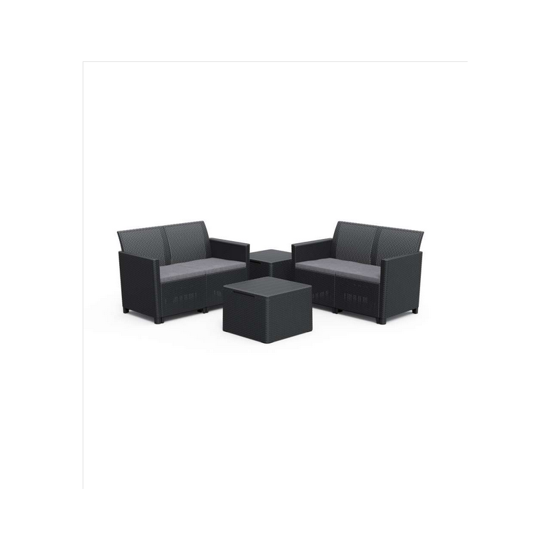 Set mobile da giardino KETER modello "CLAIRE LONGE" K253445 con 2 divani a due posti e tavolo 55,5X55,5CM , color grafite Set con 2 divani a due posti e tavolino contenitore per vestire con stile il tuo angolo di relax. Composto da due divani a due posti e tavolino contenitore utile per riporre il necessario a fine giornata e avere sempre tutto in ordine Realizzato con materiale resistente e durevole, con top effetto legno e con vimini piatto da 7mm Dotato di cuscino per la seduta Dimensioni divano: 144x64,5x74 cm. Dimensioni tavolino: 55,5x55,5x42 cm. Questo bel salottino da giardino, utilizzabile anche in terrazza, è davvero comodo e confortevole ed inoltre è veloce e semplice da montare è facile da pulire è resistente ad eventuali intemperie non richiede manutenzione