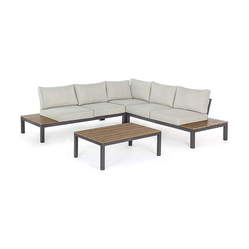 Grazie al composito imitazione legno, questo divano ad angolo ed il suo tavolino da salotto assortito