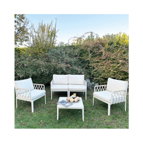GLOUPIE Salottino Da Giardino Esterno Valencia 4 Posti Completo Di Divano, Poltrone E Tavolino In Polipropilene Bianco Resistente Alle Intemperie E Ai Raggi UV, Cuscini Con Fodera In Poliestere Sfoderabili E Lavabili, Set Da Assemblare Facile Da Montare Dotato Di Sistema Modulare Per Ambienti Interni Ed Esterni Con Schienale E Braccioli Avvitabili Su Tutti I Lati Della Seduta Dalla Straordinaria Flessibilità Compositiva E Progettabile A Piacere
