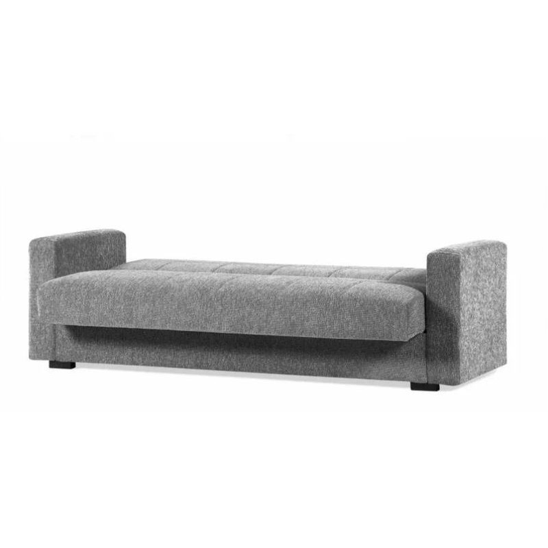 Divano letto tre posti in tessuto con braccioli e cassettone. Pratico e comodo divano velocemente convertibile a letto, con utile cassettone contenitore incluso per avere coperte e biancheria sempre a portata di mano. Divano foderato in tessuto grigio, non sfoderabile, elegante e raffinato, dalle linee semplici, potrà essere abbinato a tutti gli ambienti e permetterà di ospitare familiari ed amici in ogni momento. Imbottito con molle Bonell e cassettone interno, due cuscini sfoderabili inclusi. Le dimensioni del divano sono di 212x80x87 cm, e lo spazio utile per dormire, una volta aperto a letto sono 184x102 cm. Disponibile anche in altre finiture e nella versione 2 posti.