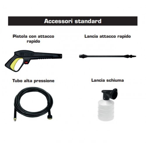 Dotata di una pistola ergonomica per facilitare le operazioni di pulizia con un tubo ad alta pressione da 3 metri che ti permette di muoverla con agilità e colpire lo sporco da ogni angolazione; Lancia con ugello Variojet che regola la potenza del getto per adattarti a ogni superficie, dalla delicatezza del legno alla tenacia del cemento; Ugello Turbo che scatena un vortice di acqua che disintegra lo sporco più ostinato; Spazzola fissa per una pulizia ravvicinata e in profondità; ed infine un lancia schiuma per un'azione di pulizia ancora più efficace