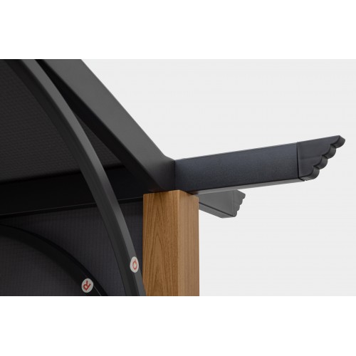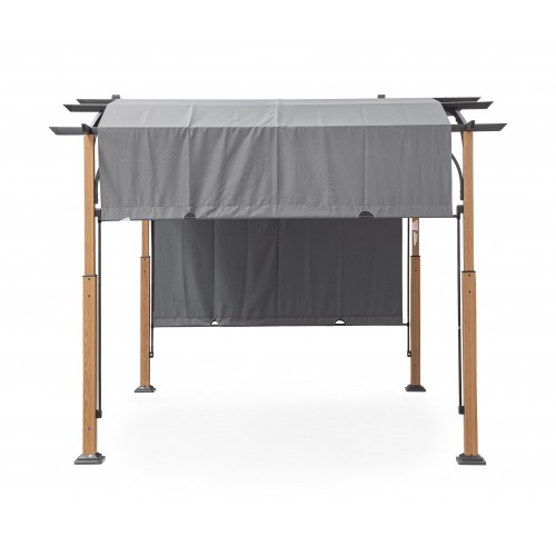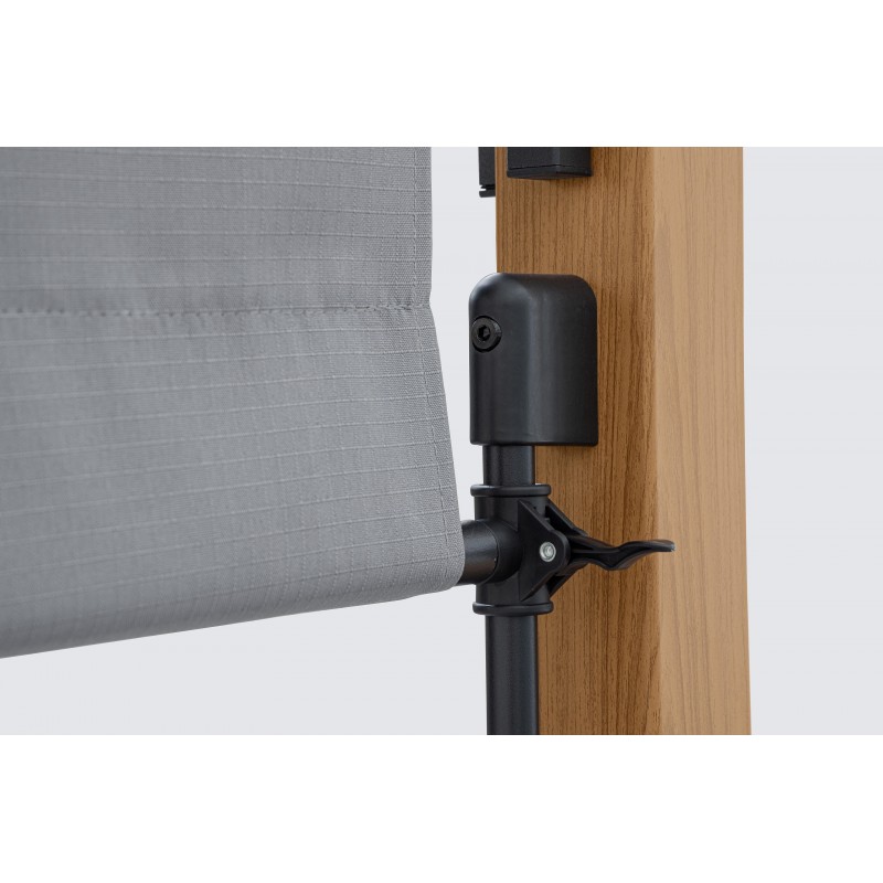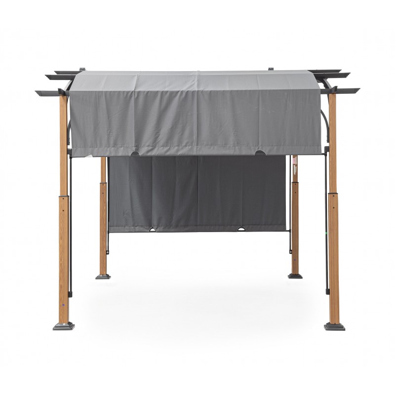 Questo gazebo di alta qualità è costruito con una struttura in acciaio trattato per esterni tramite fosfatazione e verniciatura a polvere (poliestere), garantendo resistenza e durabilità anche in condizioni atmosferiche difficili. I pali portanti hanno un elegante effetto legno con dimensioni di 80x80 mm (superiori) e 60x60 mm (inferiori), mentre i traversi laterali sono in acciaio 25x50 mm e i pali del tetto sono 50x25 mm.