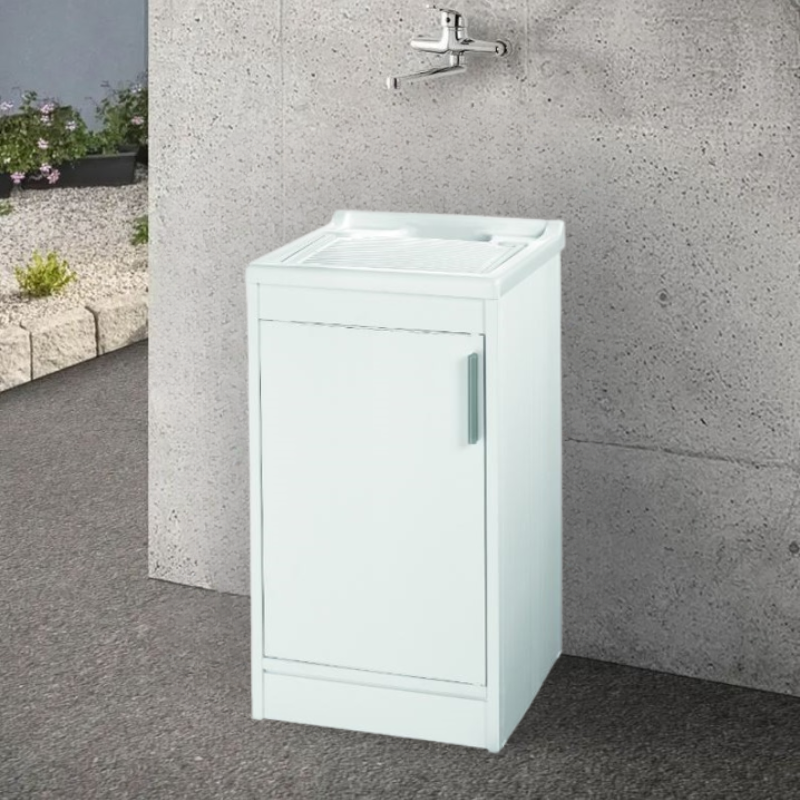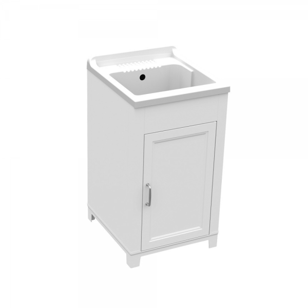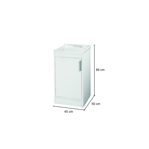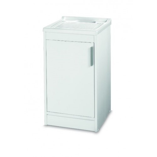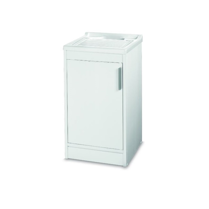 [Qualita' certificata made in italy]: Gloupie mobile lavatoio in pvc bianco ideale sia per ambienti interni che esterni con 1 anta e piano di lavaggio richiudibile, lunghezza 45 cm x profondità 50 cm x altezza 86 cm, completo di tavoletta lava panni e kit di scarico con sifone e piletta troppo pieno, 100% made in italy