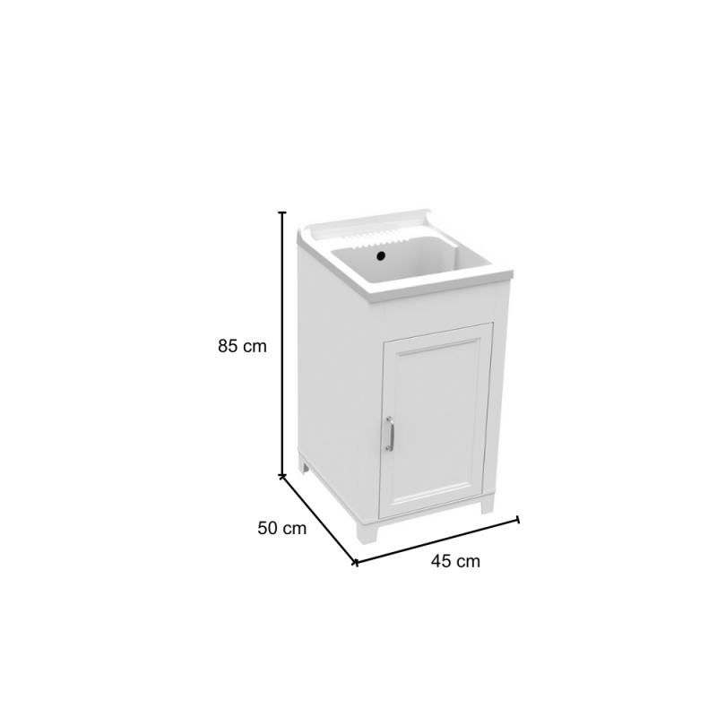 GLOUPIE Mobile Lavatoio Wash In Resina Termoplastica Di Polipropilene Bianco Ideale Sia Per Ambienti Interni Che Esterni Con 1 Anta E Vasca Di Lavaggio Resistente Agli Acidi, Lunghezza 45 Cm x Profondità 50 Cm x Altezza 85 Cm, Completo Di Tavoletta Lava Panni E Kit Di Scarico Con Sifone, Piletta Troppo Pieno, Guarnizioni In Gomma E Maniglia, 100% Made In Italy