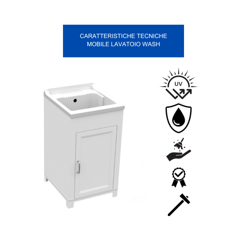 Il Mobiletto Wash è La Soluzione Salvaspazio Ideale Per Lavanderie, Balconi E Terrazzi. Dalle Dimensioni Compatte, è Perfetto Anche In Spazi Angusti. Il Piano Di Lavaggio è Perfetto Per Lavare Comodamente Capi Voluminosi Senza Che L'Acqua Possa Schizzare Fuori O Fuoriuscire All'Esterno Andando A Bagnare La Pavimentazione. L'Anta Con Maniglia Nasconde Un Vano Portaoggetti, Utile Per Riporre La Propria Oggettistica
