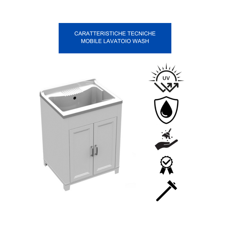 Il Mobiletto Wash è La Soluzione Salvaspazio Ideale Per Lavanderie, Balconi E Terrazzi. Dalle Dimensioni Compatte, è Perfetto Anche In Spazi Angusti. Il Piano Di Lavaggio è Perfetto Per Lavare Comodamente Capi Voluminosi Senza Che L'Acqua Possa Schizzare Fuori O Fuoriuscire All'Esterno Andando A Bagnare La Pavimentazione. Le Ante Con Maniglia Nascondono Un Vano Portaoggetti, Utile Per Riporre La Propria Oggettistica