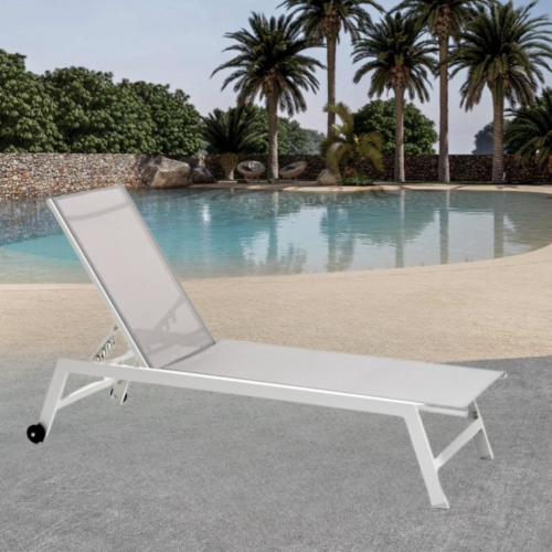 [Praticita' e comfort]: Flessibilità e praticità sono i punti di forza di alamos. Regolabile in 5 posizioni, consente di trovare l'inclinazione perfetta per un relax completo, mentre le ruote posteriori ne agevolano lo spostamento. Quando non lo usi, potrai impilarlo per ottimizzare lo spazio, caratteristica ideale anche per le aree più strette. La seduta in textilene, morbida e traspirante, ti avvolgerà piacevolmente, mentre la caratteristica anti ingiallimento ne preserva la bellezza nel tempo
